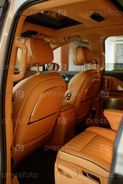 Сиденья водителя и пассажира демонстрационного автомобиля с бежевым кожаным салоном