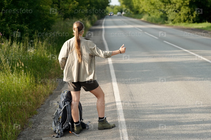 Автостопщик ловит машину на шоссе