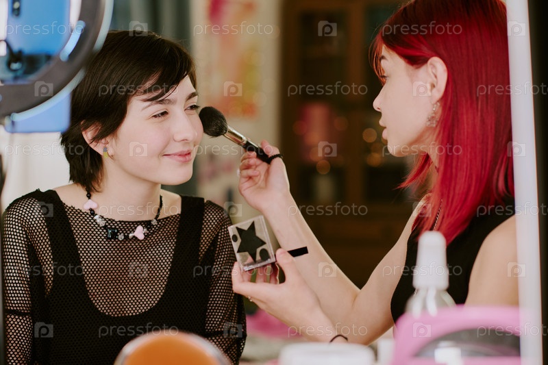 Нанесение макияжа на улыбающуюся подругу с помощью кисти и палитры