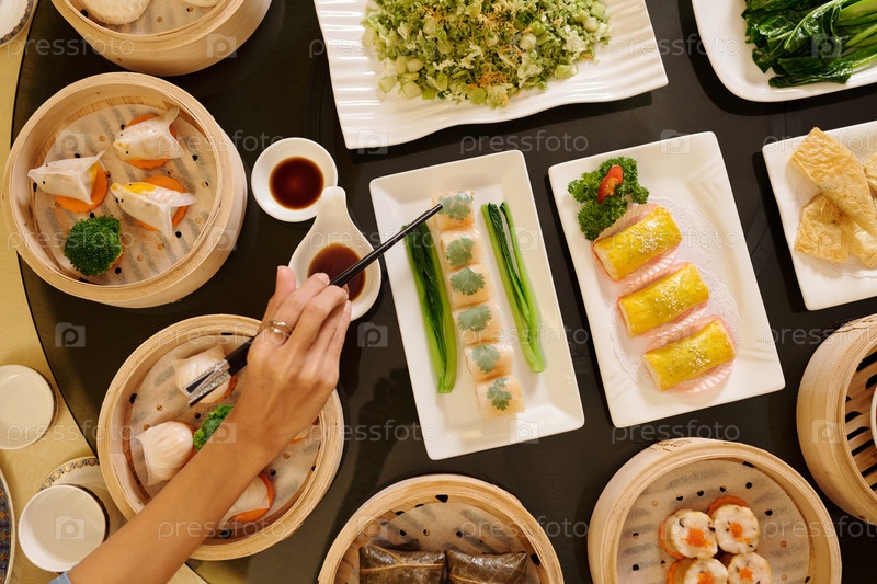 Женщина, съедающая роллы в ресторане