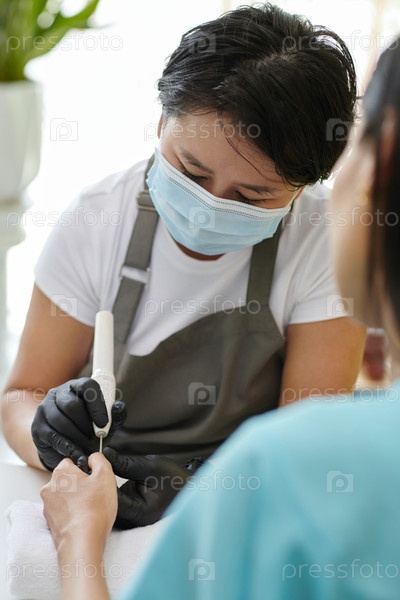 Ближайшее изображение маникюриста, убирающего женские ногти в салоне