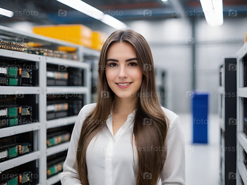 Портрет улыбающейся женщины в современной серверной комнате