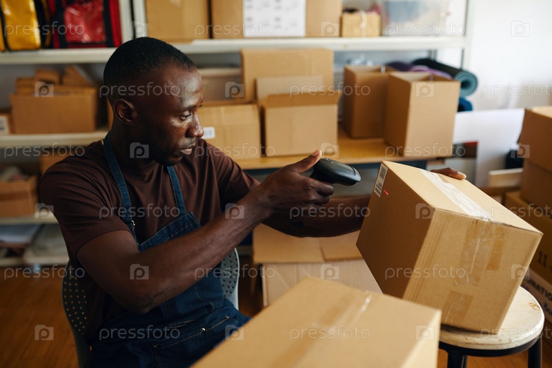 Рабочий сканирует штрих-код по заказу