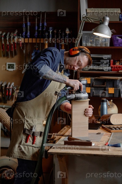 Мужчина, использующий электрический песок в мастерской, носящий фартук