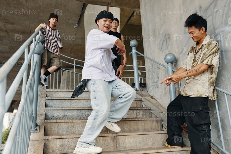 Танцы с друзьями на лестнице в открытом воздухе