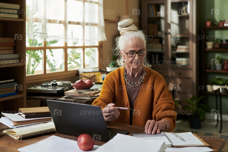 Портрет пожилой женщины с очками, работающей на ноутбуке