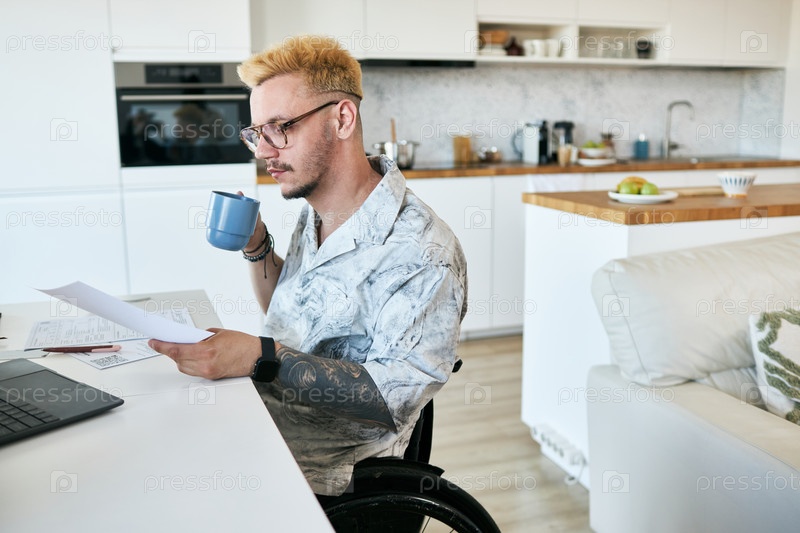 Работать удаленно с современной кухни, держа чашку кофе
