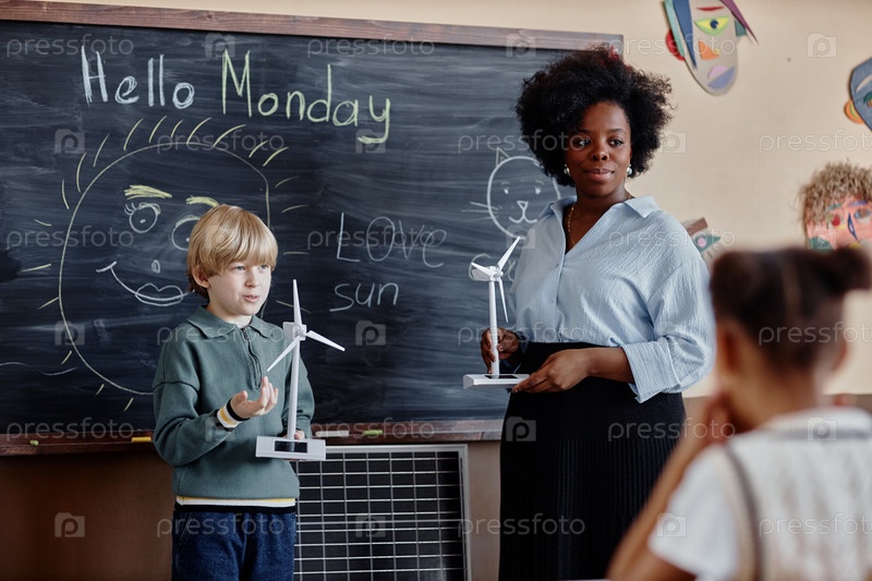 Молодой студент-мужчина представляет проект по зеленой энергии