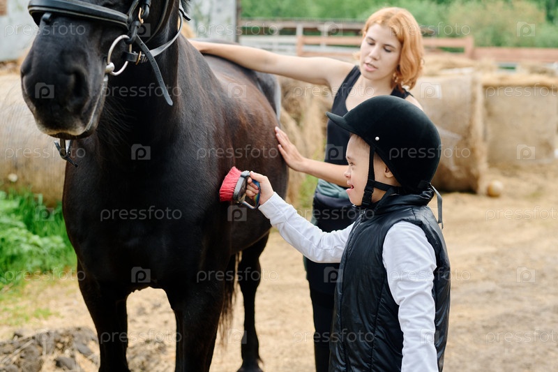 Уход за лошадью с помощью женщины на открытом воздухе Child