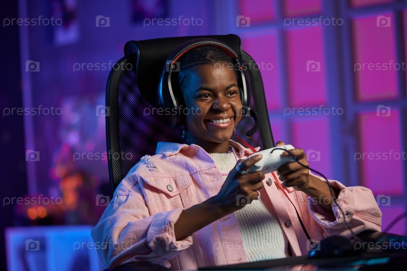 Улыбающаяся афроамериканская женщина играет в видеоигры