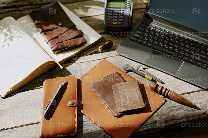 Старый стол со старыми кожаными изделиями и цифровыми устройствами