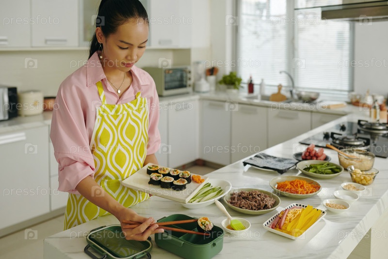 Домашняя хозяйка кладет кимбап в коробку с обедом