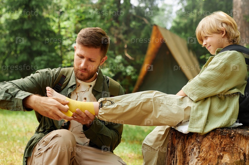 Отец перевязал ногу сына во время похода в лагерь
