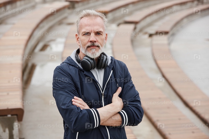 Портрет пожилого человека со сложенными руками на скамейках в парке