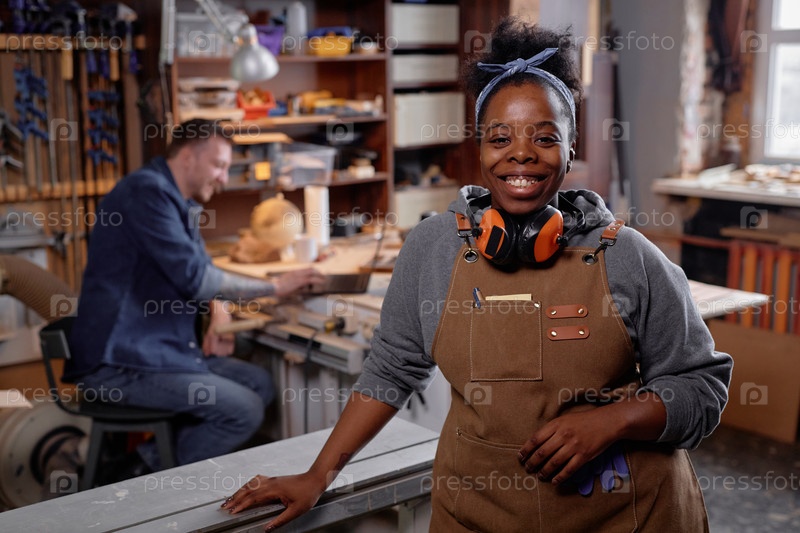 Улыбающийся ремесленник позирует в мастерской по деревообработке