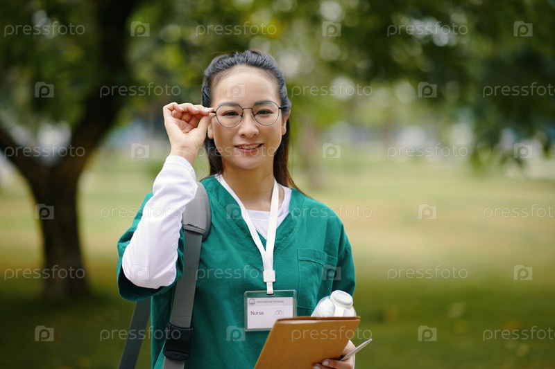 Портрет улыбающейся азиатской медсестры, держащей клипборд на открытом воздухе