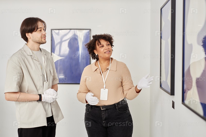 Женщина как куратор искусств, указывающая на картины