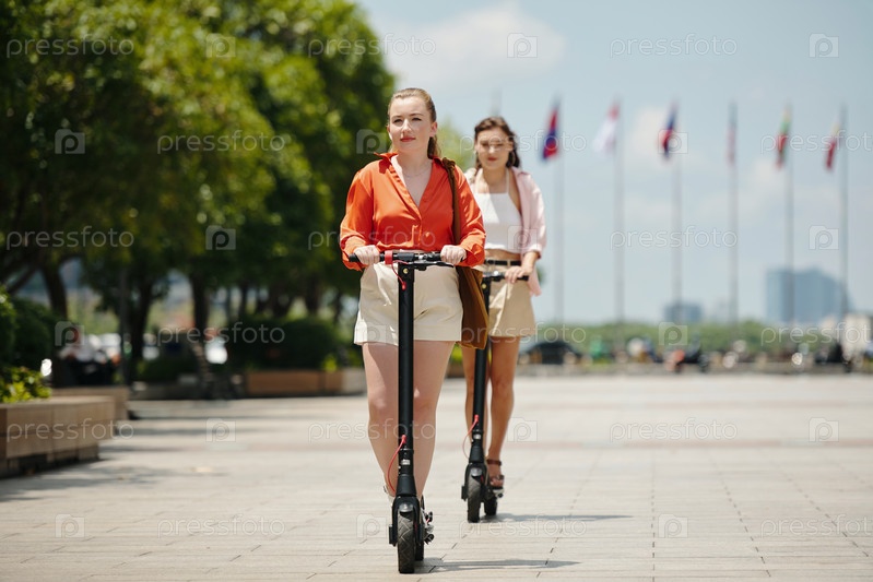 Езда на электрических скутерах в городском парке с флагами на заднем плане