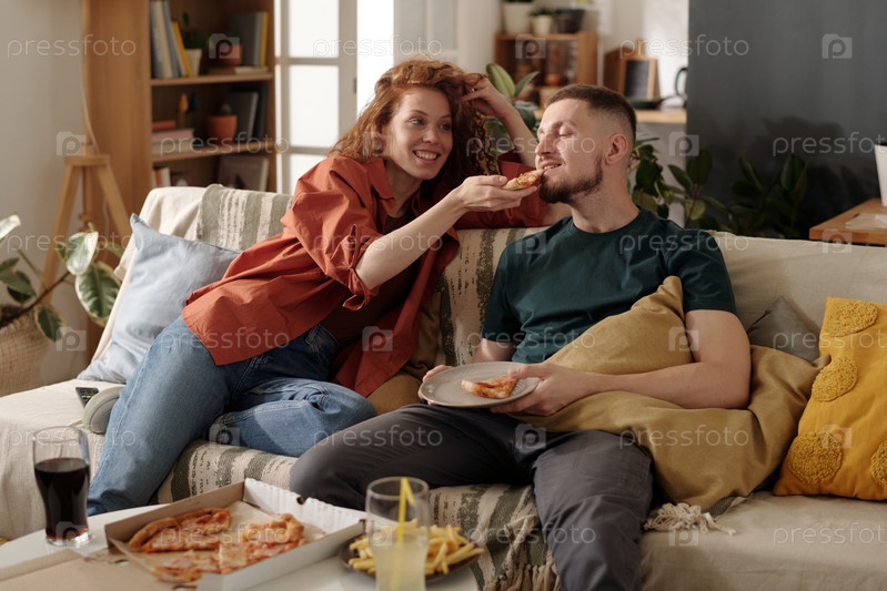 Счастливая девушка, делящая пиццу с парнем