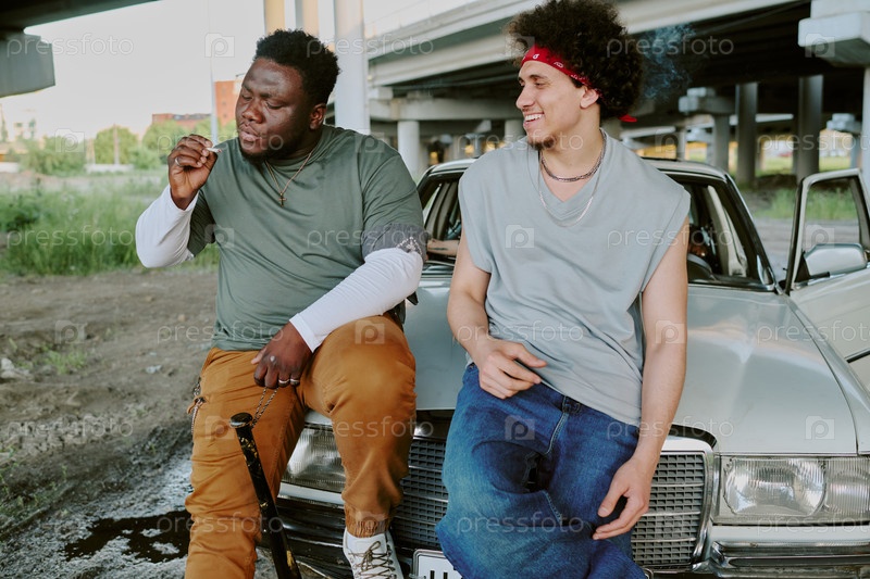 Друзья общаются рядом с машиной