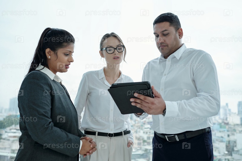 Коллеги обсуждают онлайн-презентацию в офисе