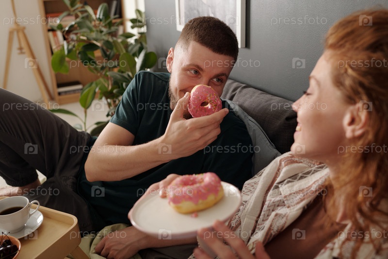 Парень, показывающий вкусные пончики своей девушке