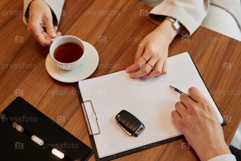 Вид сверху на ключи от автомобиля и руки женщины с контрактом в дилерском центре
