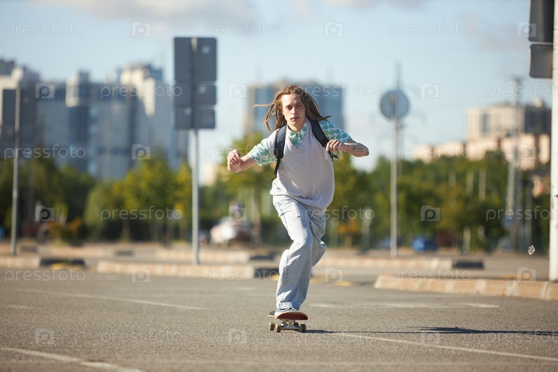 Подросток с рюкзаком, катающийся на скейтборде по улице в школу