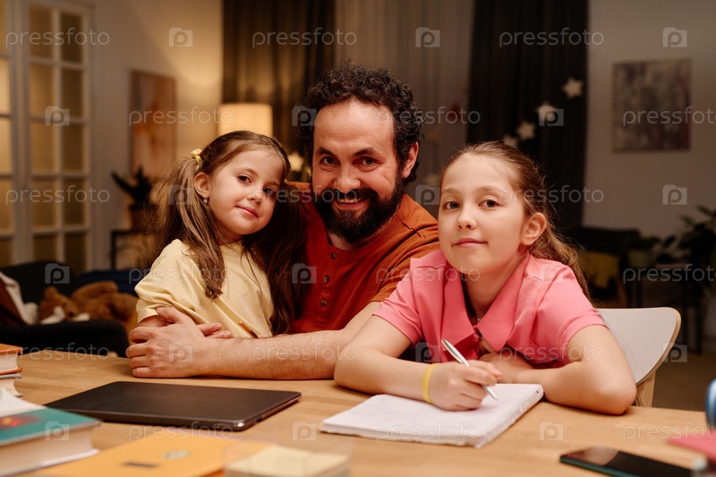 Улыбающийся отец и дочери делают домашнее задание вместе