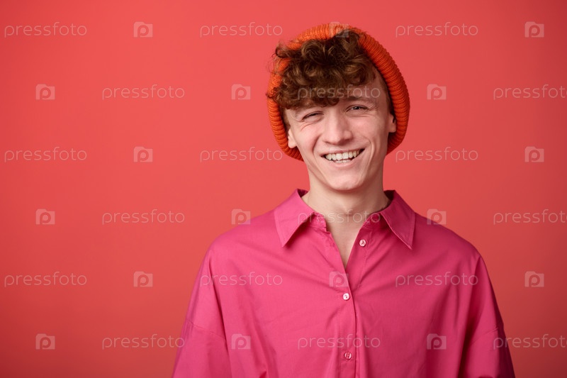 Портрет улыбающегося молодого человека в розовой рубашке на красном фоне