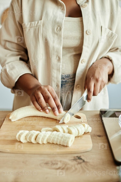 Руки чернокожей женщины, режущей бананы на бежевой кухне