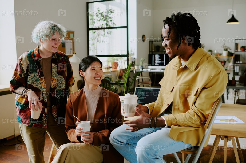 Три коллеги наслаждаются кофе-брейком вместе