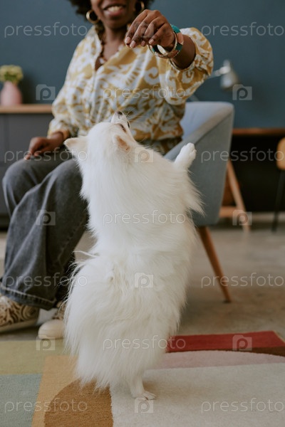 Молодая женщина взаимодействует с белой собакой-померанцем
