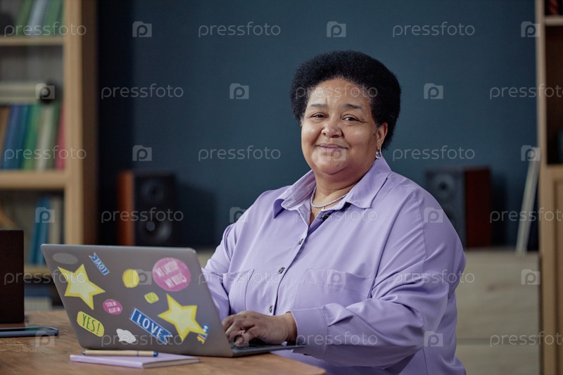 Улыбающаяся зрелая черная женщина с ноутбуком