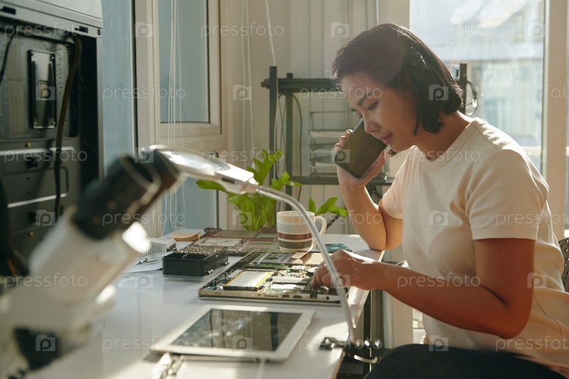 Техник разговаривает по телефону в мастерской