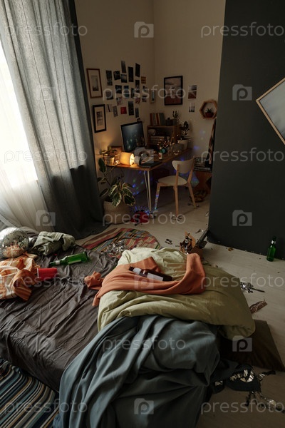 Беспорядочная двуспальная кровать с складчатыми вещами