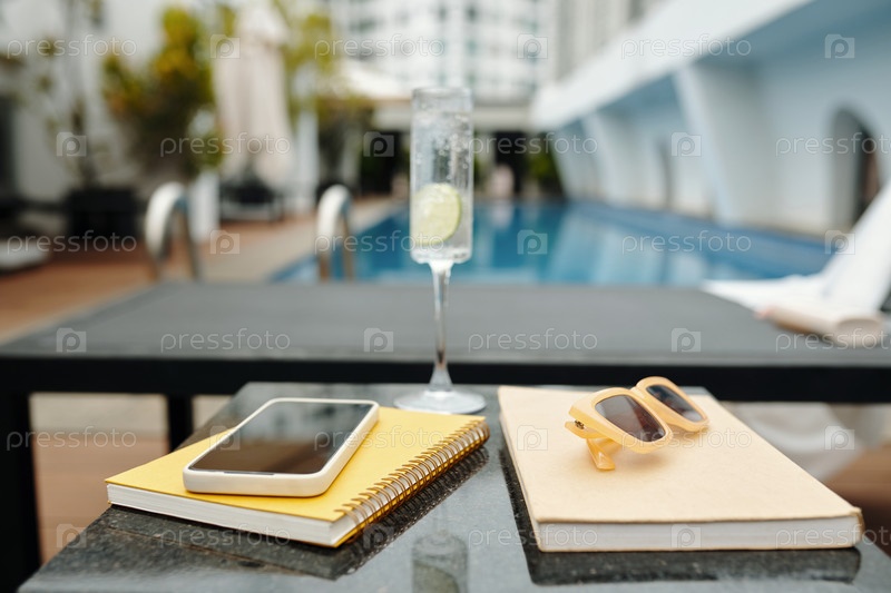 Освежающая установка у бассейна с напитком и аксессуарами