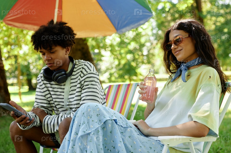 Девушка-подросток сидит на стуле, пьет газировку и чернокожий парень пользуется телефоном в парке