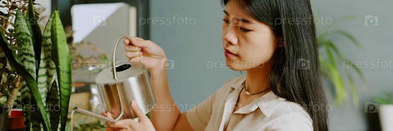 Азиатская женщина поливает растения в офисе Баннер сайта