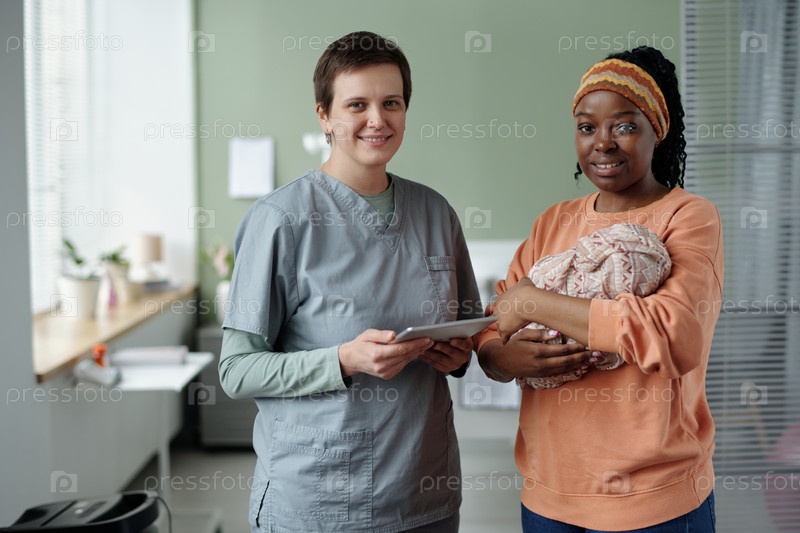 Медсестра улыбается, когда держит планшет, мать усаживает новорожденного