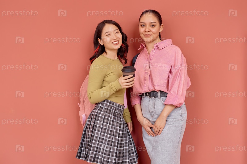 Счастливые молодые девушки колледжа, позирующие в непринужденной одежде