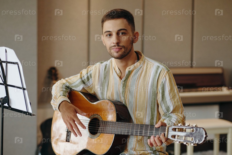 Портрет человека, играющего на акустической гитаре в музыкальной студии