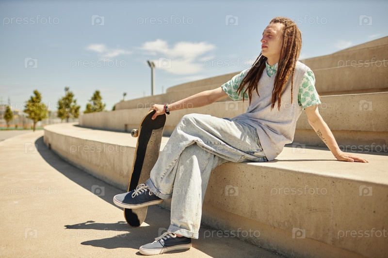Подросток-скейтбордист в джинсах сидит на скамейке в Sunshine Outdoors