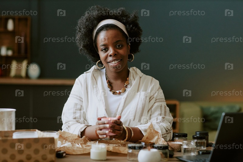 Портрет улыбающейся женщины, зажигающей свечи в уютном рабочем пространстве