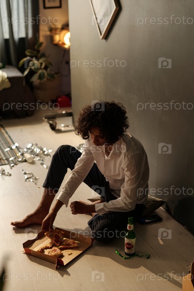 Больной парень берет кусочек пиццы на вынос