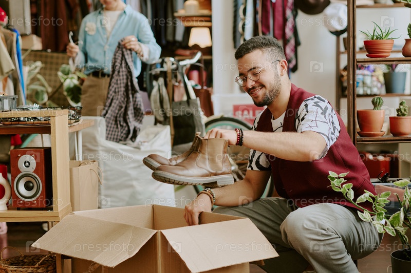 Улыбающийся мужчина осматривает кожаную обувь в мастерской