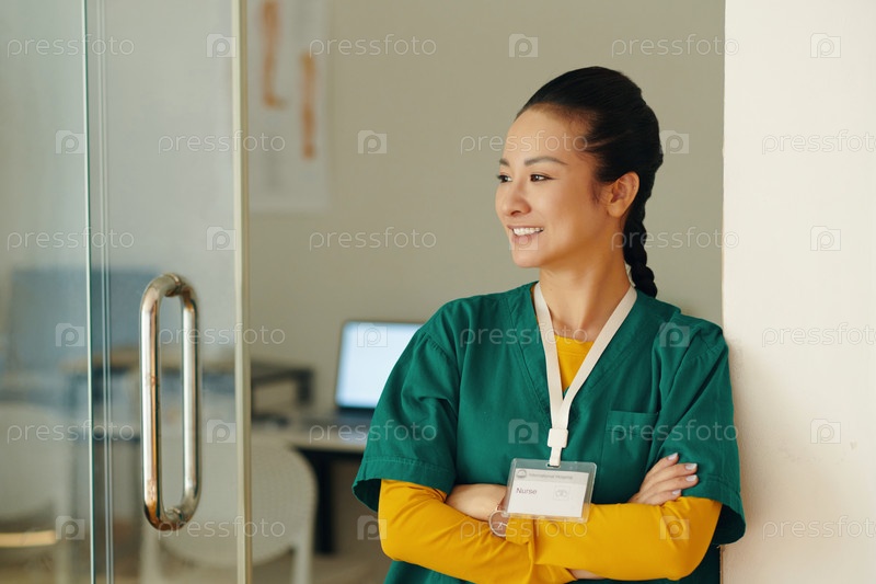 Улыбающаяся медсестра опирается на дверную коробку офиса