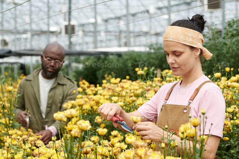 Женщина садовник на цветочной плантации, режущая желтые цветы в теплице