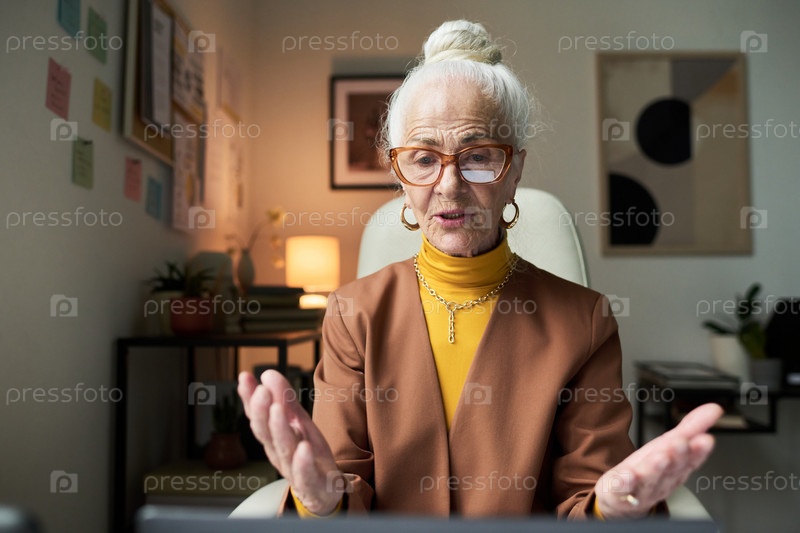 Портрет пожилой женщины с видеоконференцией в домашнем офисе