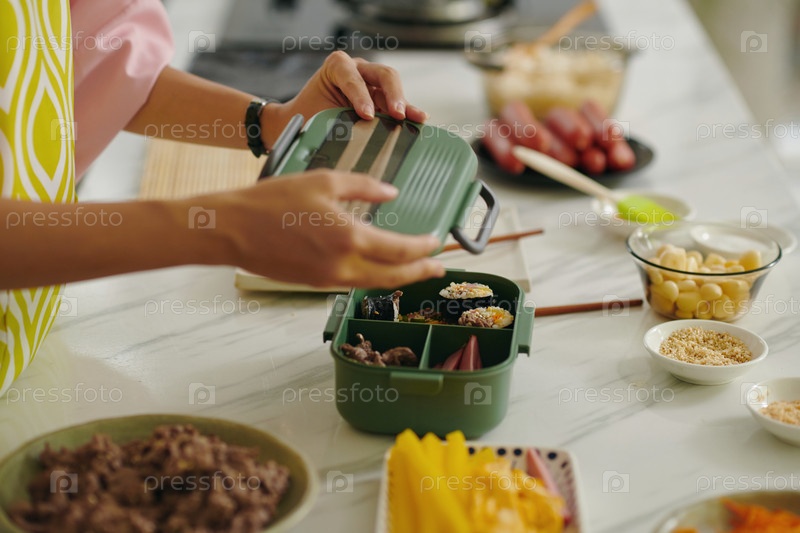 Домашняя хозяйка упаковывает еду в коробку для обеда